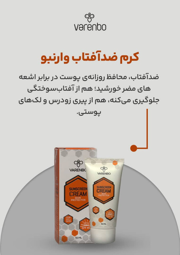 آفتاب علیرغم داشتن فواید بسیار زیاد، اثرات مخربی برای پوست دارد. آفتاب با داشتن اشعههای UVA، UVB سبب آسیبهای پوستی همچون سوختگی، خشکی، کک و مک، لک و چین و چروک یا عوارض جدیتری همچون سرطان پوست خواهد شد. به همین دلیل به استفاده منظم از ضدآفتاب تاکید میشود. کرم ضدآفتاب وارنبو با داشتن فرمولاسیون منحصر به فرد، از پوست در برابر اشعههای مضر خورشید جلوگیری کرده و پیری پوست را به تعویق میاندازد. وجود ترکیبات دی اکسید تیتانیوم و اکسید روی باعث میشود که پوست همانند آینه، اشعههای مضر آفتاب را منعکس نماید و از پوست در برابر آن محافظت نماید