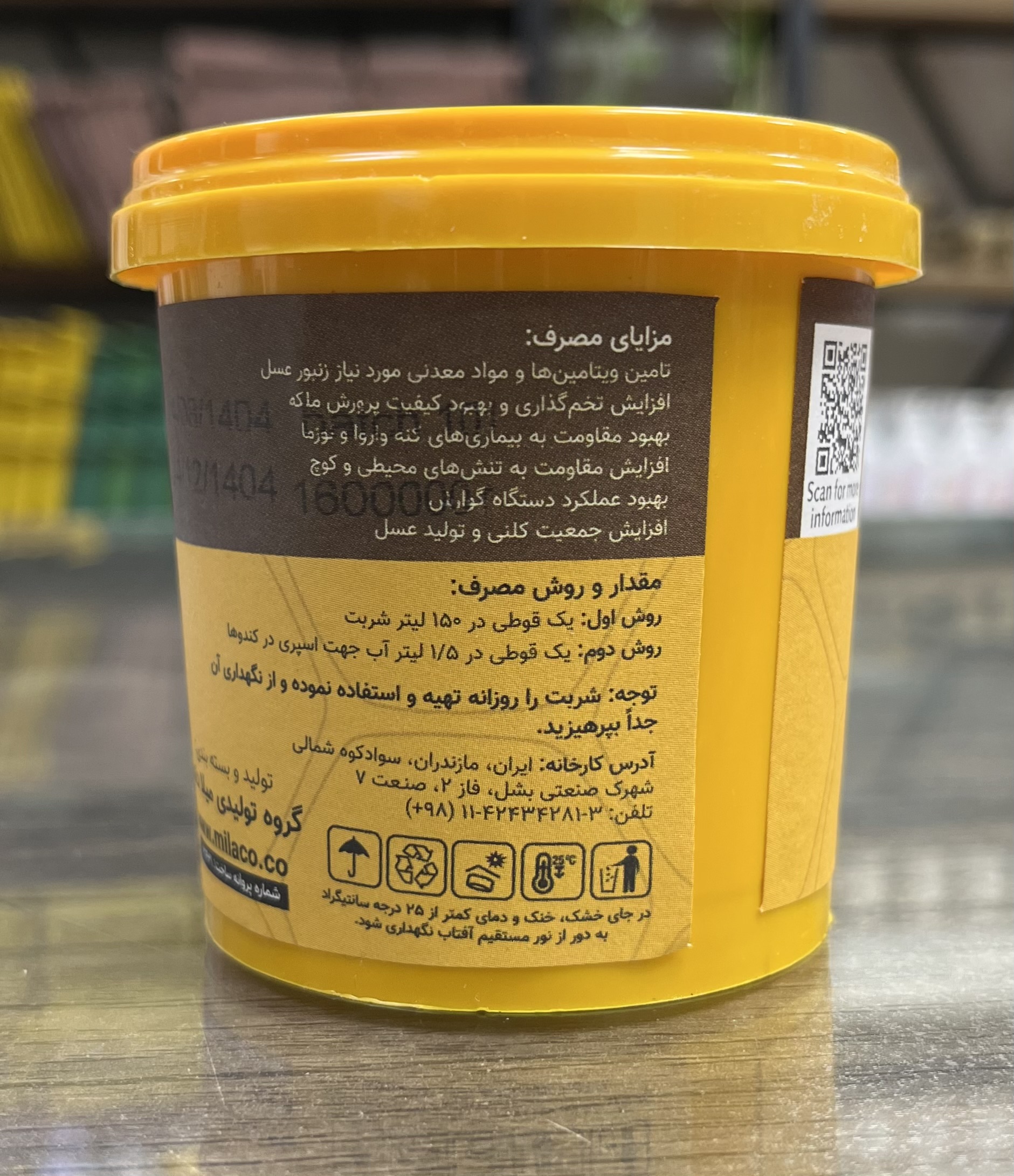 نحوه مصرف: یک قوطی در ۱۵۰ لیتر شربت- و یا یک قوطی در ۱/۵ لیتر آب جهت اسپری در کندوها
